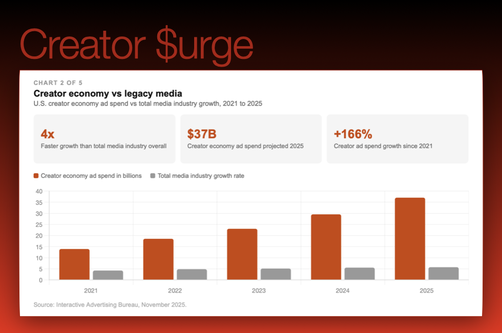 The restructuring is already documented. According to the Interactive Advertising Bureau, U.S. creator economy ad spend is projected to reach $37 billion in 2025 — growing four times faster than the media industry overall. A single individual with genuine expertise, a camera, and a direct audience relationship is now a more economically viable media entity than a mid-sized publisher with legacy infrastructure and a generalist mandate. This is not disruption. It is permanent restructuring of where media authority lives — and who gets to carry it.
