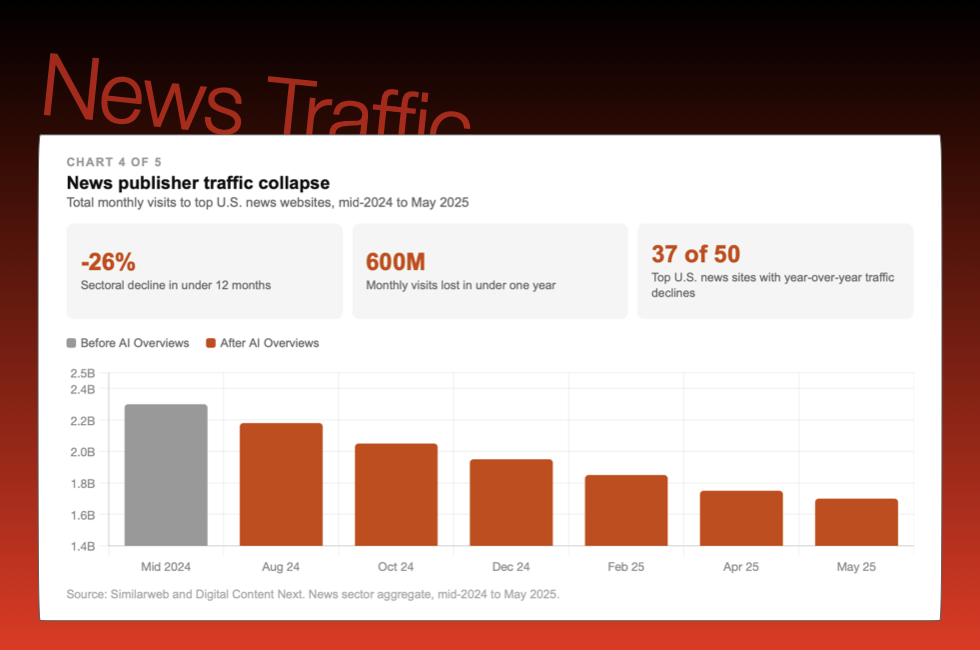 News Publisher Traffic Collapse Six hundred million monthly visits gone in under a year. This is what Distribuption looks like in the data — not as projection, but as documented reality.