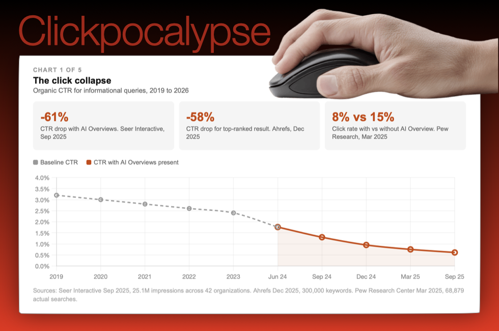The organizations that understood distribution as their business are already losing. The click — the fundamental unit of digital media economics for twenty-five years — is being systematically eliminated. According to Seer Interactive's analysis of 25.1 million impressions, organic click-through rates fell 61% in fifteen months when AI Overviews were present. Six hundred million monthly visits to news publishers disappeared in under a year. These are not projections. They are documented, sourced, and already in the past tense.