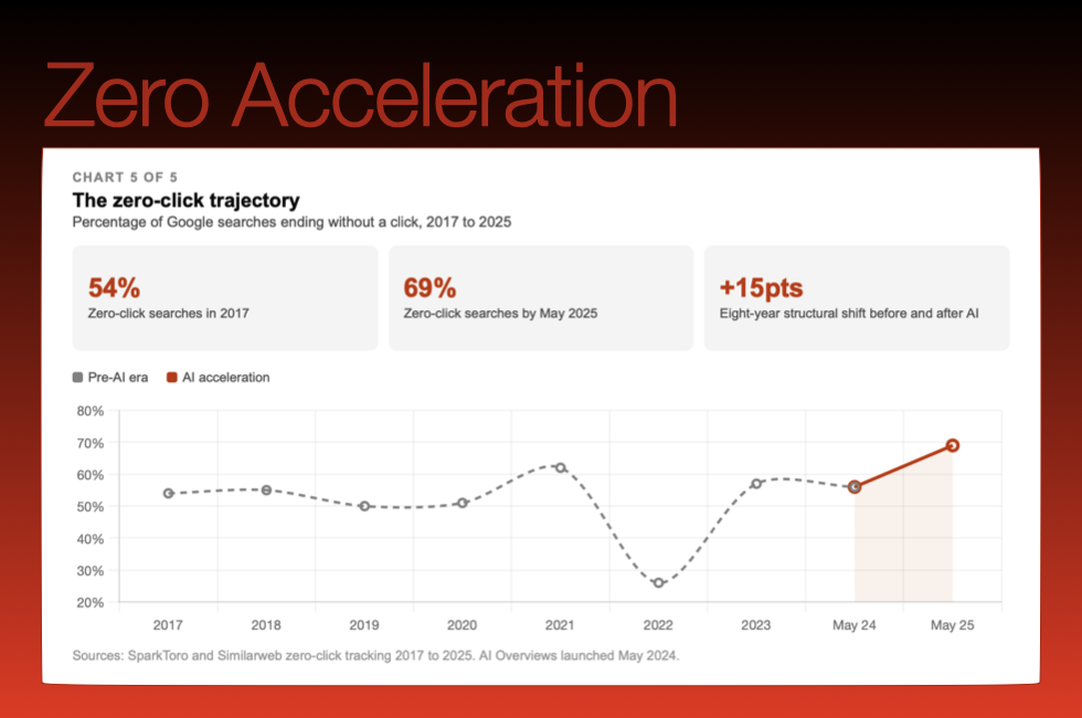 The Zero-Click Trajectory This was structural before AI arrived. AI accelerated it. The audience was already finding answers without clicking. Now the search layer intercepts the transaction entirely.